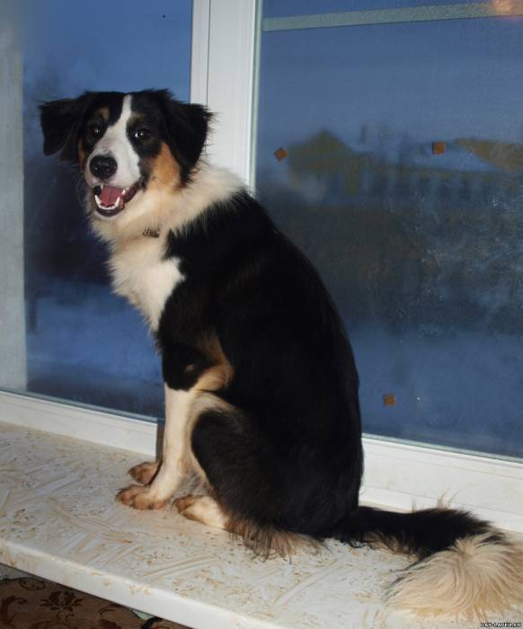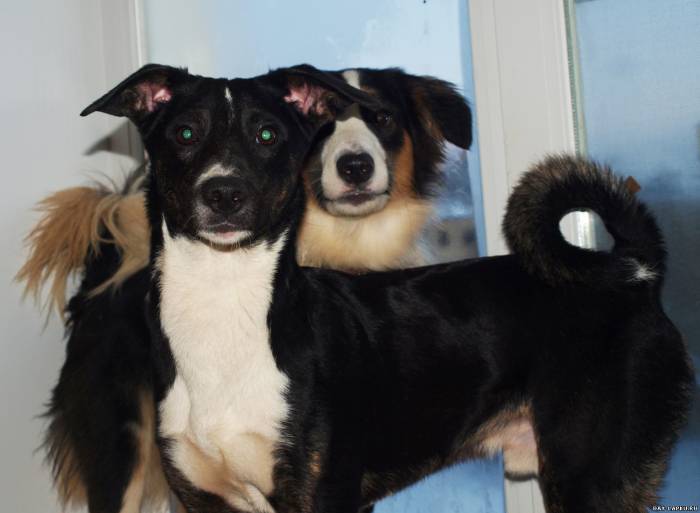 | 2 мальчика 6 месяцев, на переднем плане Тарзан, на заднем Барон. Барона нашла слепым, сама выкормила. похож на метиса бордер колли.
